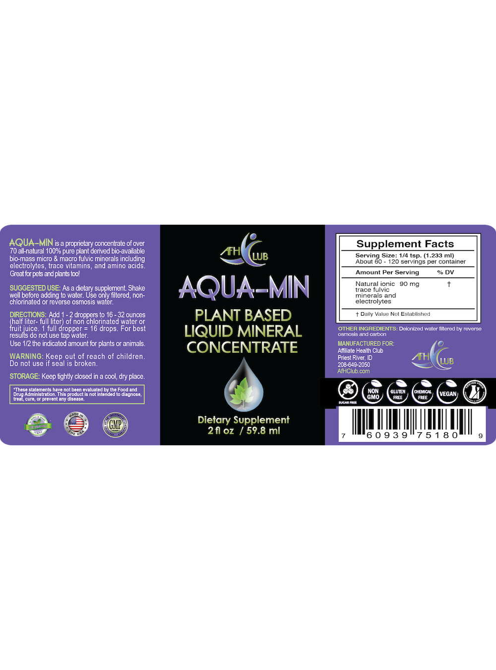 AQUA-MIN CONCENTRATE is a fulvic mineral supplement derived from plants which consists of 70+ bioavailable trace minerals along with natural plant complexes. These complexes contain traces of amino acids (that form proteins), traces of vitamins, and traces of enzymes that would have been in our fruits and vegetables had they been growing in mineral-rich soil.